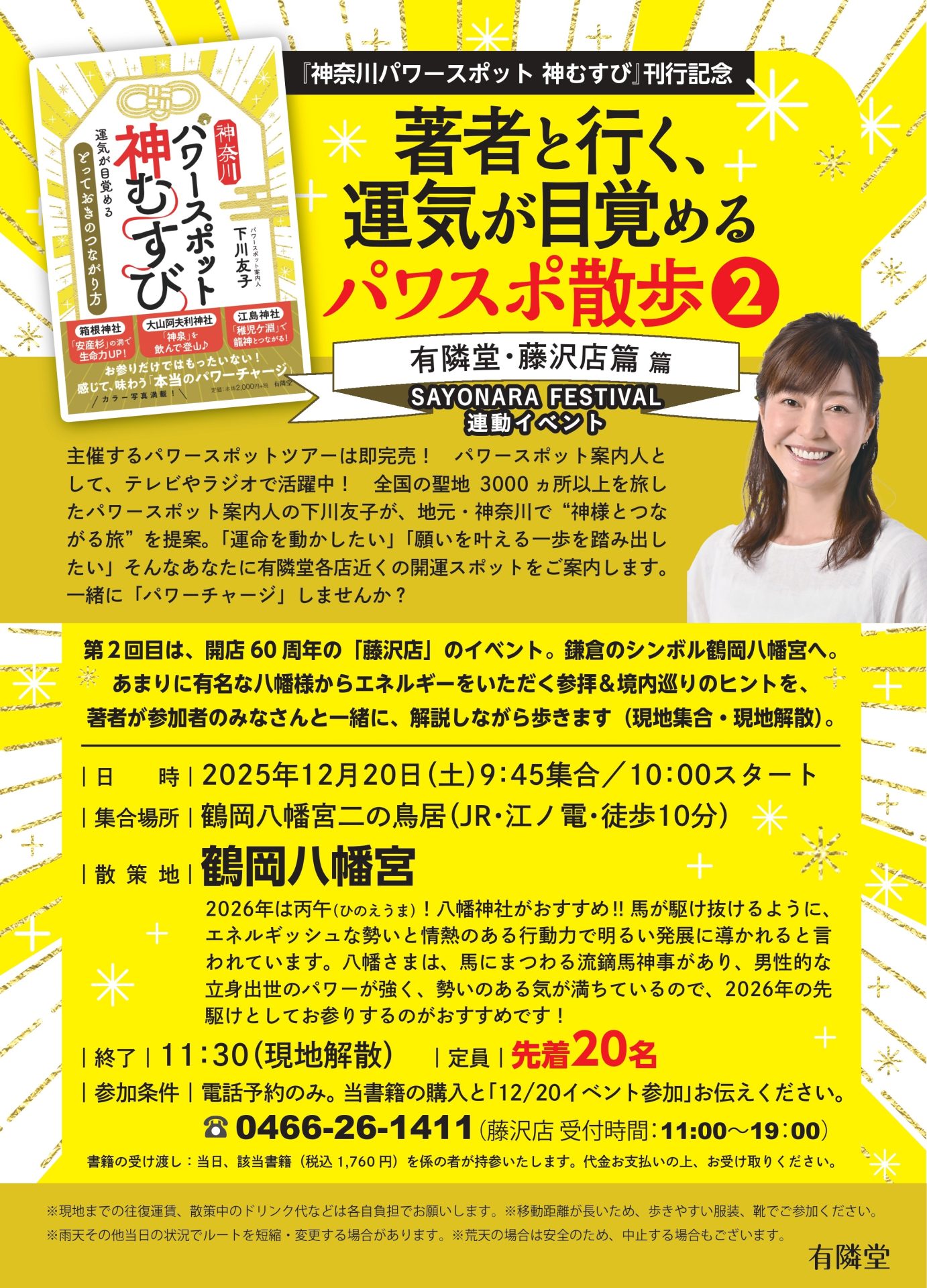 このたび、『神奈川パワースポット 神むすび』刊行を記念して、地元・神奈川に目を向け、有隣堂各店の近隣にあるパワースポットを著者と一緒に巡る連続イベントを開催します。