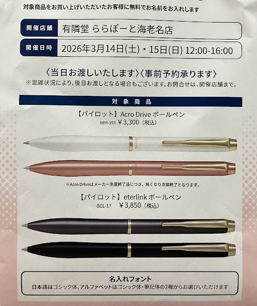 対象商品:Acro Driveボールペン 対象商品をお買い上げいただいたお客様に無料でお名前をお入れします。 ギフトにもオススメ。 是非、ご来店ください。