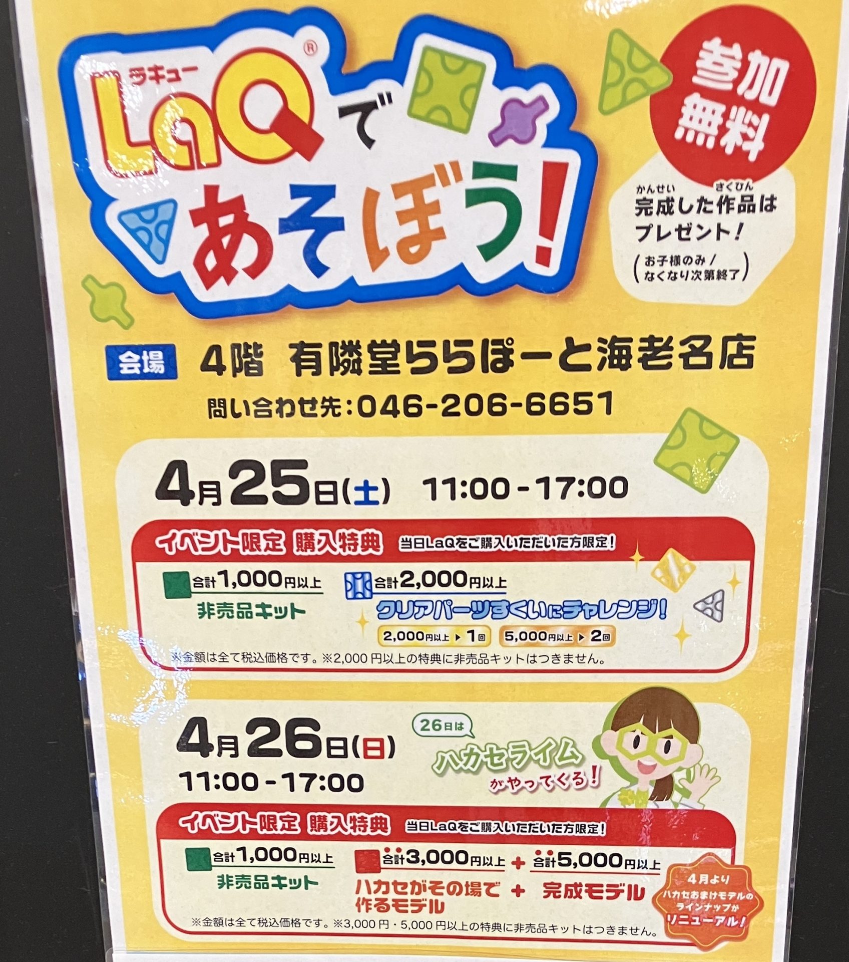 お子様限定でLaQ無料体験会実施✨ 26日(日)は大人気のハカセライムがやってきます! イベント限定購入特典もあるよ♪ 是非、遊びに来てね!